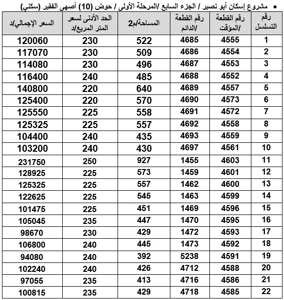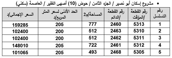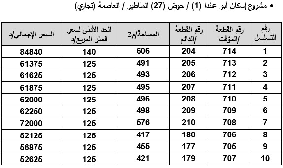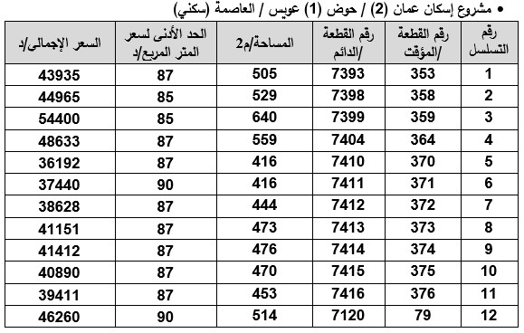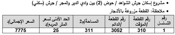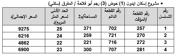 * الراغبين في الشراء يمكنهم مراجعة مديرية الأملاك في مبنى المؤسسة/ الدوار الثالث، للاطلاع على الاحكام التنظيمية الخاصة بالقطع وخدمات البنية التحتية ومعاينة القطعة معاينة تامة نافية للجهالة وقبولها بحالتها الراهنة قبل ايداع الطلب.