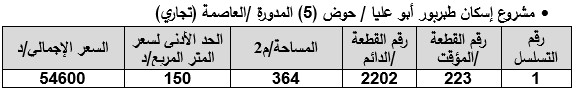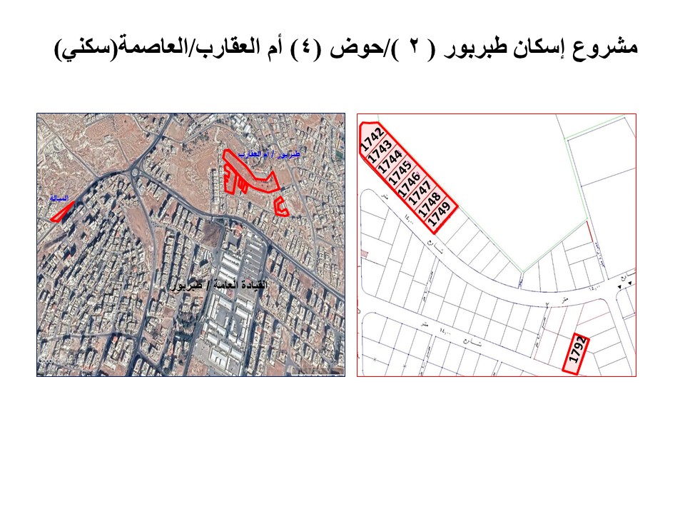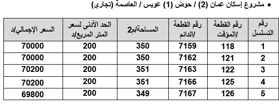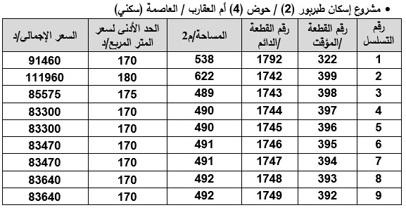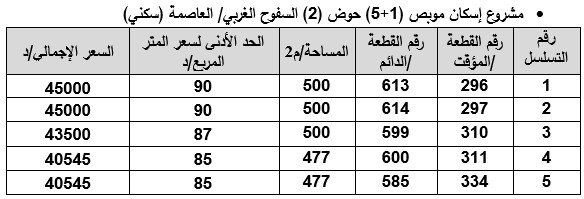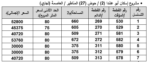 * الراغبين في الشراء يمكنهم مراجعة مديرية الأملاك في مبنى المؤسسة/ الدوار الثالث، للاطلاع على الاحكام التنظيمية الخاصة بالقطع وخدمات البنية التحتية ومعاينة القطعة معاينة تامة نافية للجهالة وقبولها بحالتها الراهنة قبل ايداع الطلب.